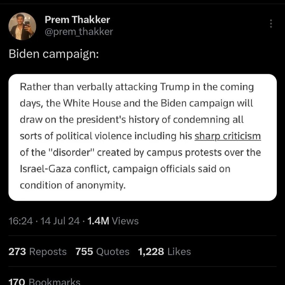Which is to say that in fact Biden's reference to campus protests reflecting political violence at all, much less an assassination attempt, is both nonsensical and bad politics. US built planes dropping US made bombs on refugee camps in Gaza while our President gaslights us is political violence. Protesting that genocidal violence, and the deployment of state violence to suppress that protest, is not political violence. As adults we can no longer deploy the “I'm rubber you're glue” defense. And as is always the case for the GOP, every accusation is projection.